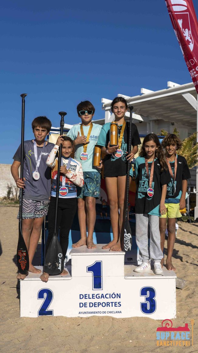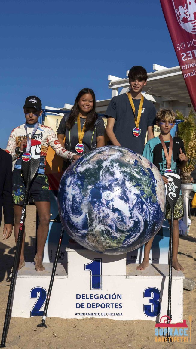 En categoría SUB 14, los competidores Álvaro del Pino y Laura Ailing continúan cosechando excelentes resultados en este circuito andaluz de Stand Up Paddle. Los acompañaron el alicantino Ziro Mollá y Katrina Hansen Shcherbinina en lo más alto del pódium correspondiente a la categoría SUB 16