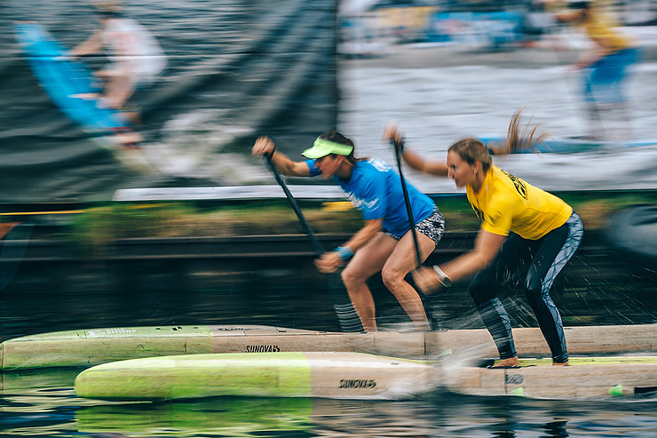 Tristan Boxford, moviendo los límites del deporte del Stand Up Paddle a nuevas alturas y en nuevas direcciones, siempre está buscando nuevos formatos dinámicos que emocionen a sus riders y proporcionen un escaparate adecuado para este deporte. Las competiciones de velocidad en los Hackney Marshes como parte del London SUP Open fueron un reflejo de ese pensamiento. El equipo del APP, junto con el director de la carrera, Anthony Vela, crearon un nuevo recorrido compacto y ajustado para emocionar a los espectadores y desafiar a los riders de clase mundial para que se desempeñen el mejor papel posible. Cuatro competidores por heat tenían moverse en direcciones opuestas entre sí, rodeando una boya exterior y volviendo a cruzar en medio de la arena frente a la multitud, antes de dirigirse a una boya lejana en el lado opuesto del recorrido antes de hacer un print hasta la última curva y luego pasar a través del arco de la APP. A medida que avanzaba el día, también lo hacían los heats mientras los riders se enfrentaban entre sí en este nuevo recorrido que requería giros de boya ajustados y pensar con rapidez.