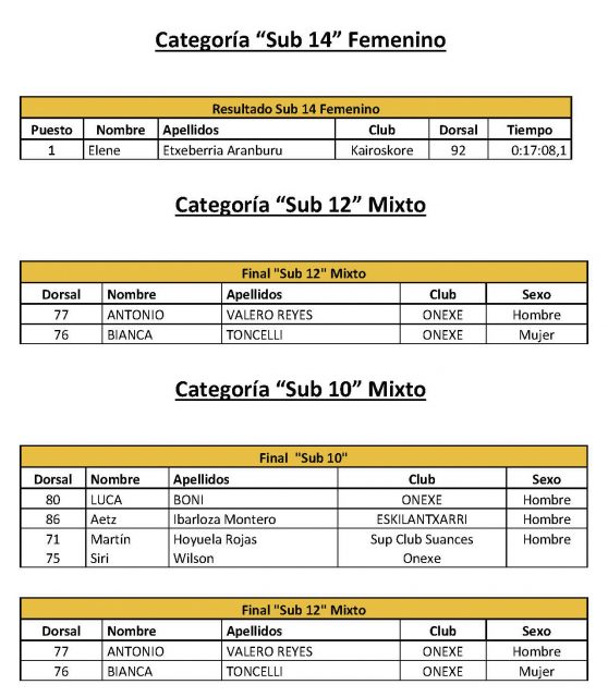 Los más pequeños también tuvieron su participación en este Campeonato de España de Beach Race con las categorías SUB 10, SUB 12 y SUB 14. Estos realizaron un recorrido más corto y visible para todo el público, en una zona de la playa con más seguridad para todos los competidores. Como ese habitual en este deporte, los padres y familiares de éstos fueron arropados en todo momento, disfrutando al ver a los pequeños surfear olas y medirse con otros compañeros. Destacar los excelentes resultados del equipo Onexe de Fuerteventura, así como de Kairoskore de Donosti, Mar Balear de Mallorca y los equipos cántabros presentes.