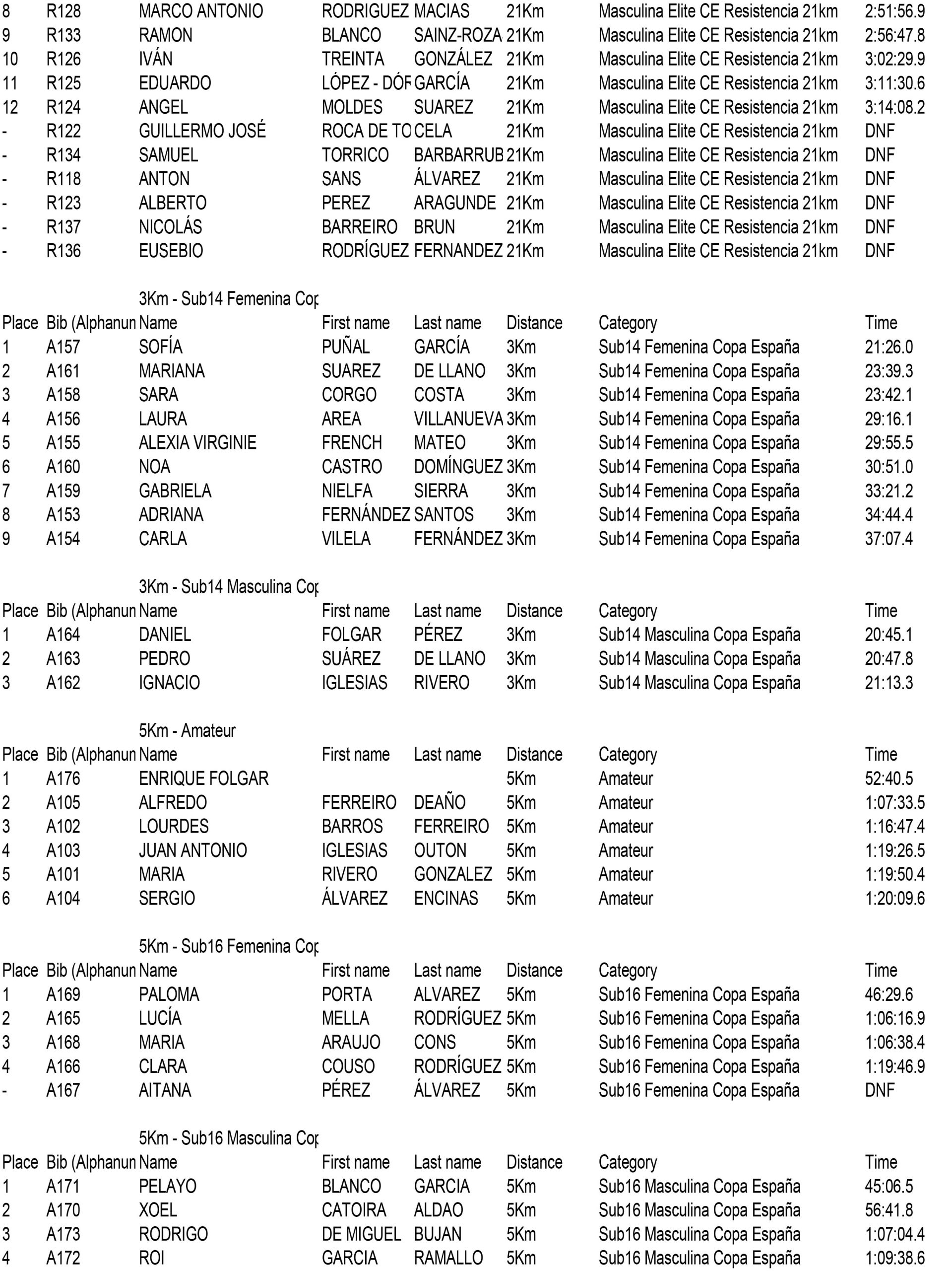 La categoría Élite realizó 2 vueltas al recorrido, donde la gallega Laura Gil y Miquel Roigé fueron los primeros en completar dicha distancia, por delante de Nicolás Barreiro y Tomás Sánchez en categoría masculina; y con Ana Marta Pérez y Marta Abruñedo por parte de las chicas. En cuanto a los SUB 18, los participantes Pablo Blanco y Xavier Castro subieron a lo más alto del pódium.