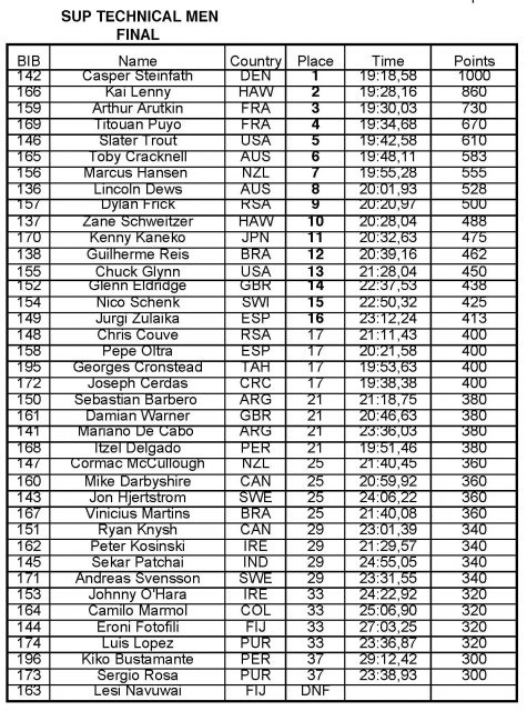 El día terminó con una espectacular final para decidir el campeón de la Carrera Técnica de SUP de Hombres. En la recta final el danés Casper Steinfath agarró una de las olas que rompían en Cloudbreak aprovechándola para adelantar a todo el pelotón en cabeza pasando de quinta a primera posición. La lucha por la Medalla de Plata la ganó el hawaiiano Kai Lenny que deleitó a todos los ahí presentes con un potente sprint final. Arthur Arutkin (FRA) y Titouan Puyo (FRA) ganaron las medallas de Bronce y Cobre respectivamente.