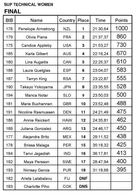 La Carrera Técnica de SUP de Mujeres fue la penúltima del día donde la Neozelandesa Penelope Armstrong vencía a la hasta ahora defensora del título, Candice Appleby (USA) que fue coronada con la Medalla de Bronce. La francesa Olivia Piana se llevó la Medalla de Plata y Kate Gilbert ganó la Medalla de Cobre.